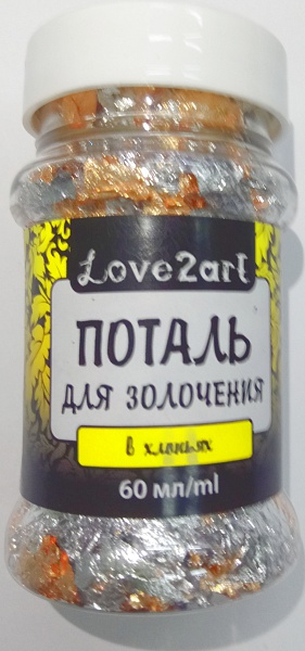 Поталь в хлопьях — сыпучий материал из металлической фольги. Применяется для декоративного золочения, серебрения и меднения поверхностей из разных материалов, создает эффект мерцания. Благодаря наличию в одной упаковке хлопьев трех оттенков (золото, серебро и медь) позволяет добиться интересного цветового решения. При нанесении хлопья в изобилии насыпаются на участки, предварительно смазанные специальным клеем. Слой потали выравнивается с помощью широкой кисти с длинным ворсом.